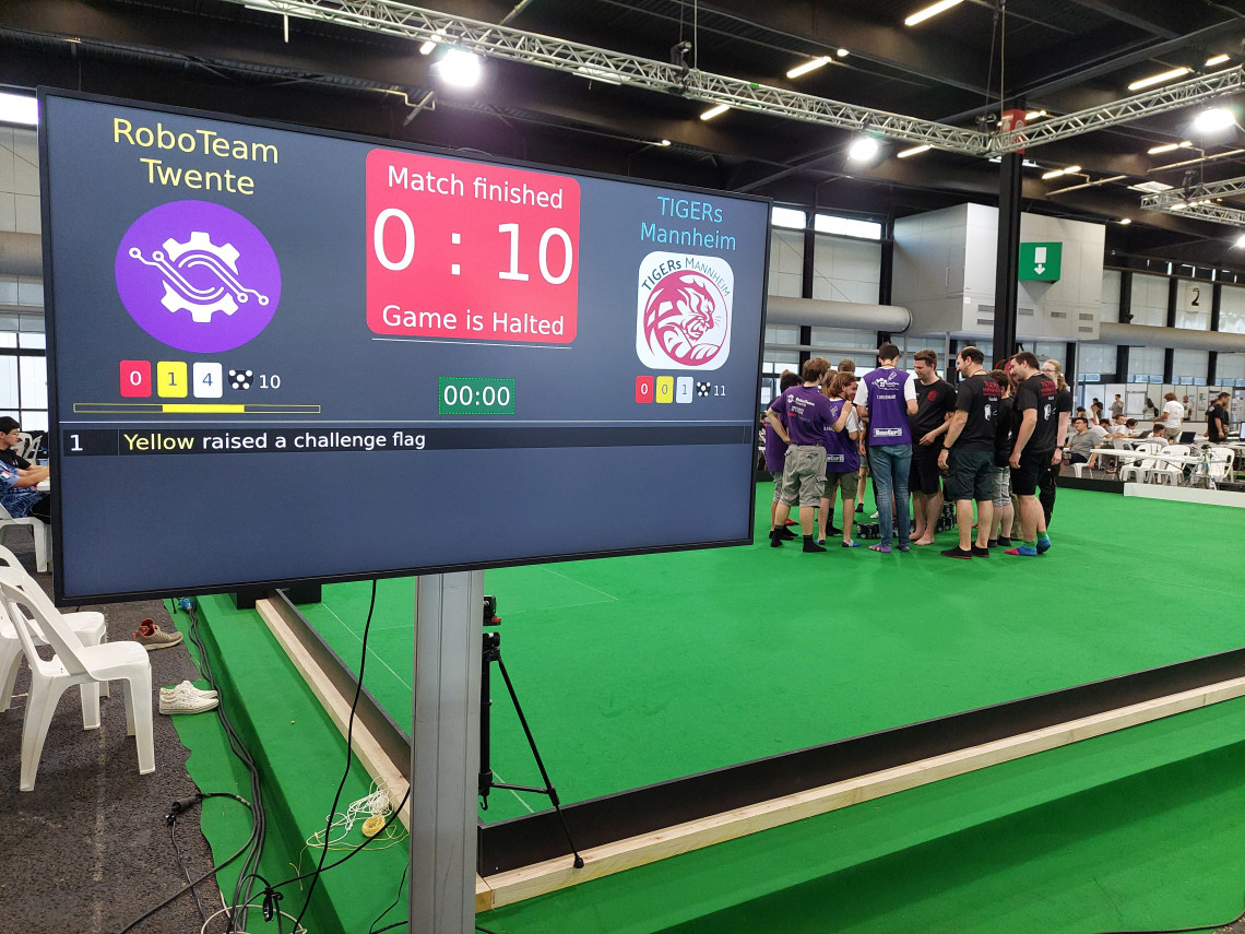 Door het oponthoud start de wedstrijd van RoboTeam Twente tegen de TIGERs uit Mannheim iets later dan gepland. Lang duurt het echter niet voordat de eerste goal valt. Nadat keeper R2D2 eerst fabuleus redt, schuift hij een seconde later de bal in Duitse voeten. De score stapelt zich vervolgens snel op: de elf Duitse robots spelen met militaire precisie en discipline en laten de drie opgestelde Twentse voetbalrobots kansloos. Al in de eerste helft lopen ze uit naar een 10-0 score. Dat is ook direct de vroegtijdige eindstand. Het is hoe de Britse voetbalpresentator Gary Lineker het ooit zei: ‘Football is a simple game; 22 men chase a ball for 90 minutes and at the end, the Germans win.’ Een vergelijkbaar adagium geldt ook deze RoboCup, voor hun robotequivalenten. Om nog extra zout in de wonden te strooien, vieren de Duitse robots hun overwinning in stijl: een strak gegroepeerd dansje, op de melodie van de Macarena – die ze zelf ten gehore brengen.