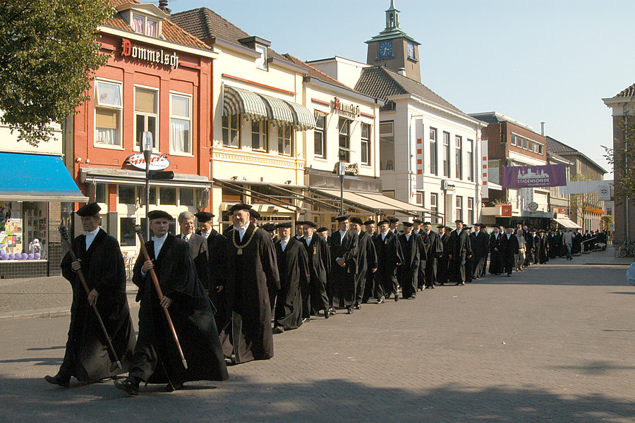 (Foto: de opening van het academisch jaar in 2005, het cortège in het centrum van Enschede)