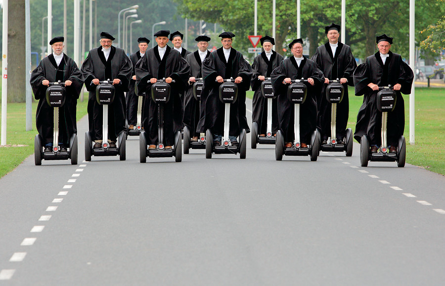 Elektrotechniek-hoogleraren rijden rond op een segway, om hun opleiding onder de aandacht te brengen (2008).