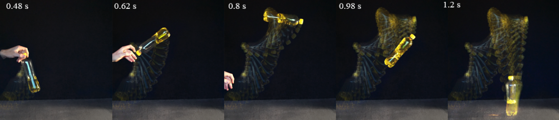 The water bottle flipping challenge refers to spinning a bottle with water and making it land upright. It might not sound too difficult, but it is in fact rather curious (and unlikely) for such a fast rotating object to make a stable landing. Yet, it does. ‘If you flip a bottle and observe it carefully, you can see that it slows down in the air, which makes it land safely. We wanted to know why exactly that happens,’ says Lumen Eek. The group then started flipping partially filled bottles, filming them and analyzing their behavior.