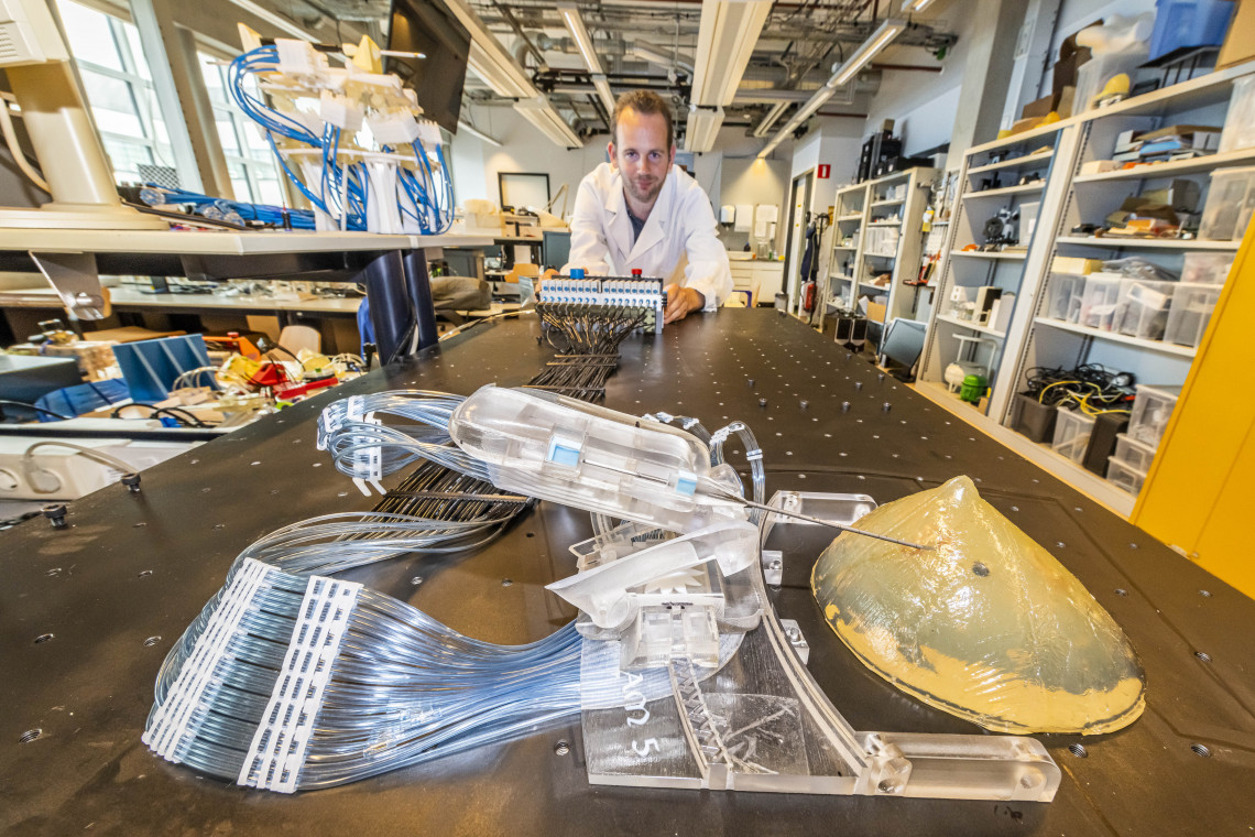 Groenhuis picks up a small, 15-centimeter-long plastic device that is somewhat reminiscent of a small armored vehicle. A long, protruding hollow needle looks like the cannon. ‘This is the latest model of my biopsy robot,’ he says. ‘It is capable of taking biopsies from breast tissue in a very accurate way.’ He places the robot in front of the breast model and with a control panel he directs the long needle with immense precision and subtlety into the rubber breast. A hissing sound from pressurized air accompanies the movement of the needle. Plastic, hollow tubes, only a few millimeters in diameter, appear to control the tiny machine. The engines inside the robot are completely made out of plastic and work on air pressure. The absence of metal parts enables the scientists to use this biopsy machine inside an MRI during the screening for possible tumors. This way, they can accurately take a biopsy of a tumor under MRI guidance.