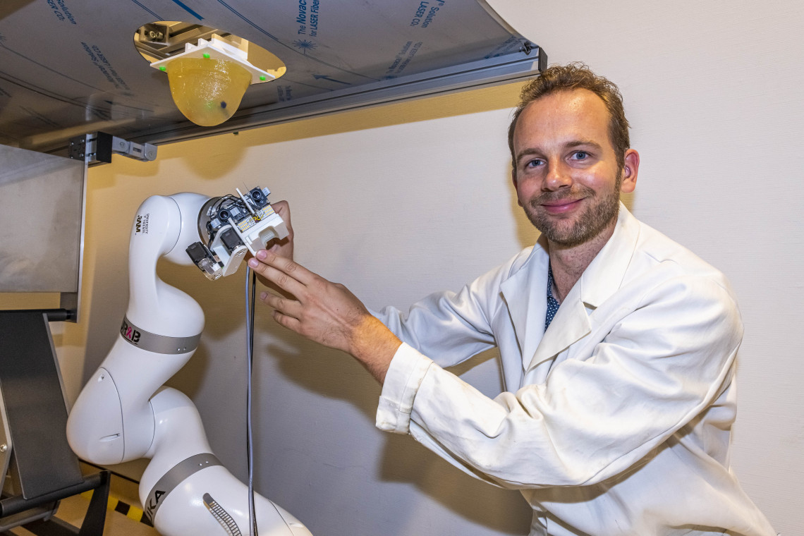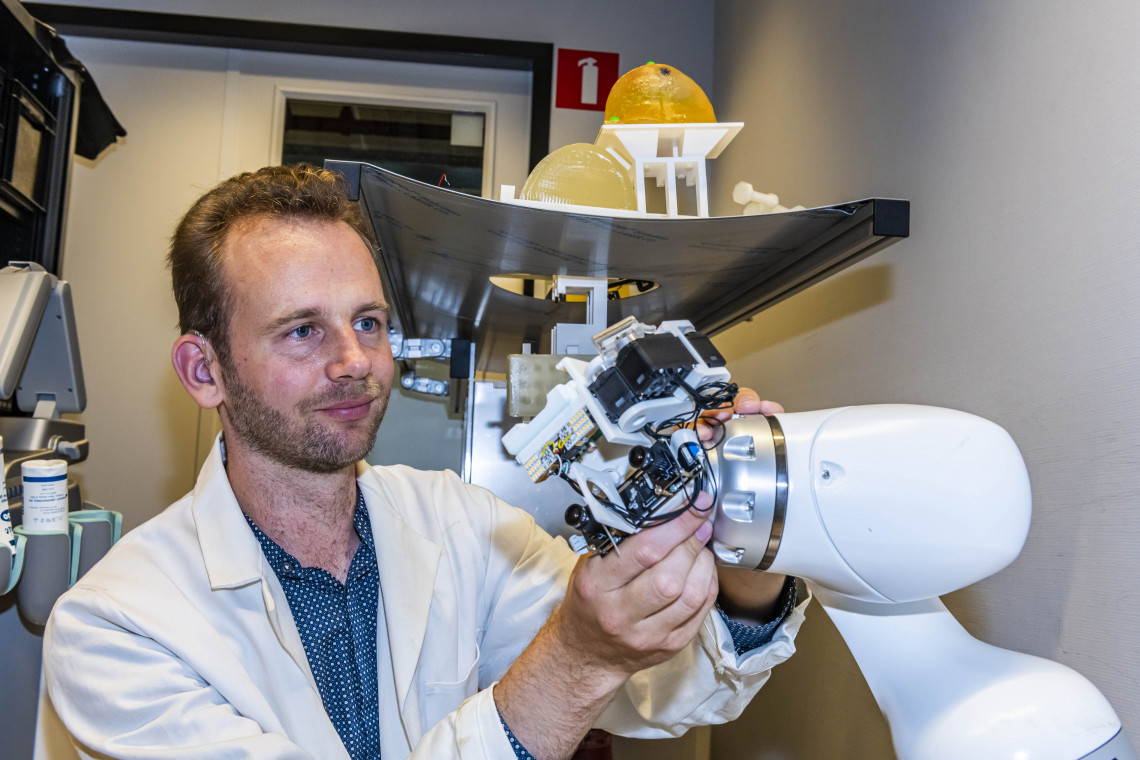 The laboratory desk of scientist Vincent Groenhuis is scattered with plastic parts, bundles of small tubes, and complicated looking control devices. But what catches the eye are the rubbery replicas of a female breast. ‘These models are used to test our biopsy robots. They are made of PVC plastisol, PVC combined with harmless plasticizers, to make it flexible and resemble breast tissue,’ Groenhuis explains. ‘We don’t use silicon, because that mutes the ultrasound, we use for guiding the biopsy needle.’