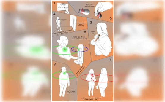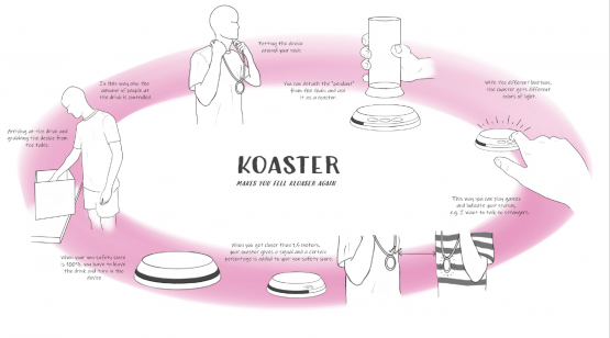 Koaster This interactive coaster around your neck will make it fun to keep your distance during drinks. The 'penalty light' on the coaster gets brighter when people get too close to each other. Users can also indicate whether they are in for a chat through different colors. If your 'non-safety score' is one hundred percent, you have to hand in the coaster and you are ‘game over’.