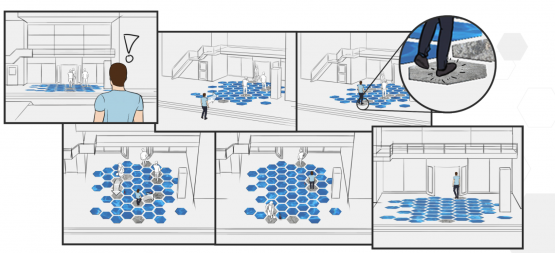 Smart Path These smart tiles at the entrance of the Horst Tower ensure that people keep a distance of 1.5 meter. Users are guided by the tiles when entering or leaving the building. This improves the flow of people and helps to keep a safe distance through a playful interaction.