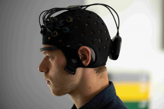 Voor deze studies worden studenten ingeschakeld, vertelt UT-onderzoeker Nienke Bierhuizen. ‘De proefpersonen krijgen een soort cap op hun hoofd. Dit apparaat, ontwikkelt door Artinis Medical Systemens, meet hersenactiviteit aan de hand van infraroodlicht. Ook worden er sensoren om de hand gedaan, waarmee we het hartritme en zweet kunnen meten.’ Ten slotte krijgen de proefpersonen een soort band om hun hoofd, die de hersenen als het ware afluisteren aan de hand van elektrische activiteit. ‘Deze koppeling tussen brein en computer noemen we een Brain-Computer Interface (BCI).’