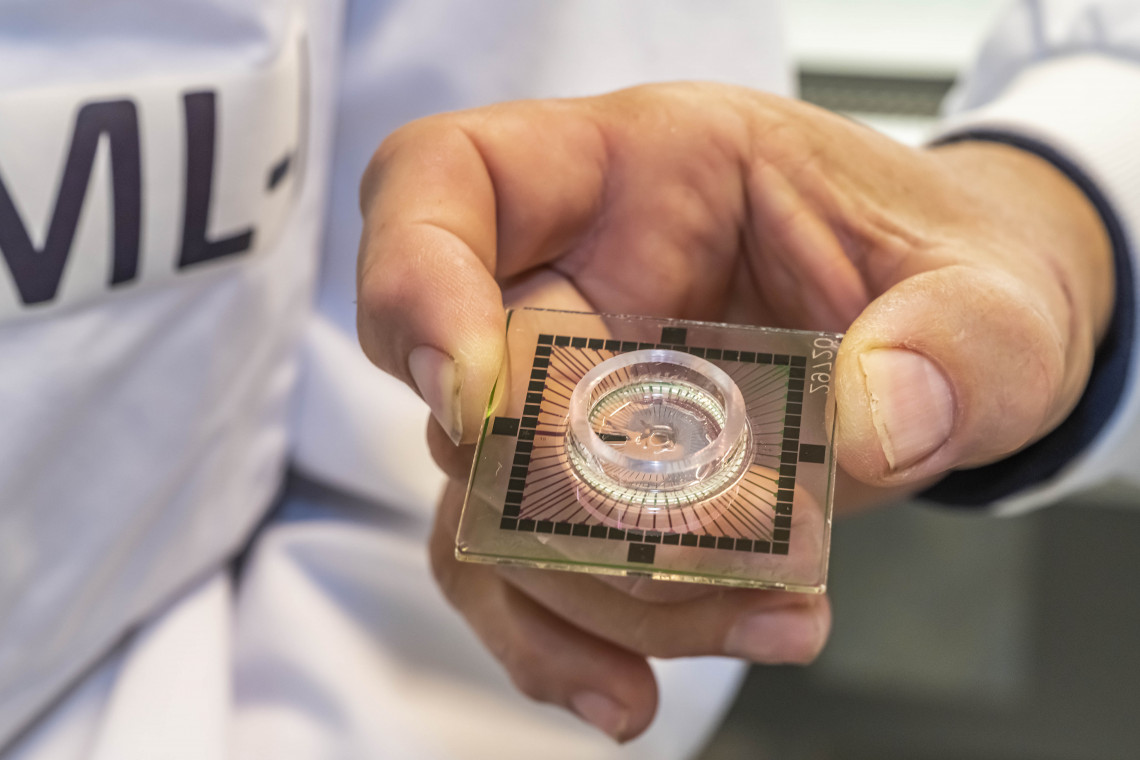 Le Feber points to his experimental set-up in the lab of Clinical Neurophysiology: ‘This is where the magic happens.’ Silicon hoses supply fresh air into a closed, Plexiglas box, where a small, round container holds living brain cells in a reddish fluid. ‘In this glass container, the brains cells attach to the bottom and start growing and connecting and communicating with each other, a process that takes about three weeks,’ Le Feber explains. ‘Electrodes on the bottom detect their activity, but they can also be used to stimulate the brain cells.’ When the brain cells have developed sufficient connections, they communicate, and activate each other, resulting in a synchronous activity. This activity is monitored by the connected computer, where a screen shows colored lights flashing synchronously. Le Feber: ‘This synchrony indicates that the brain cells communicate well and are healthy.’