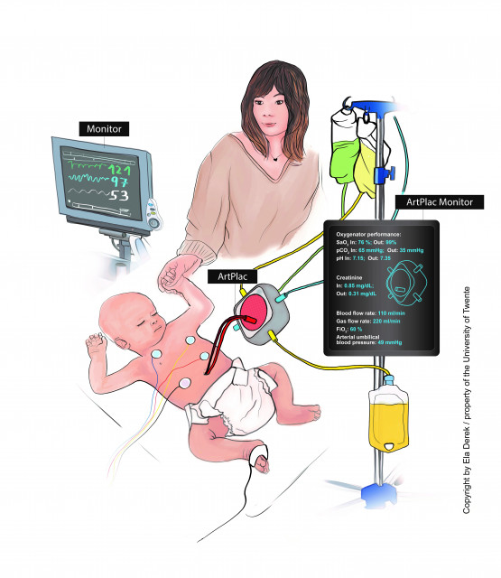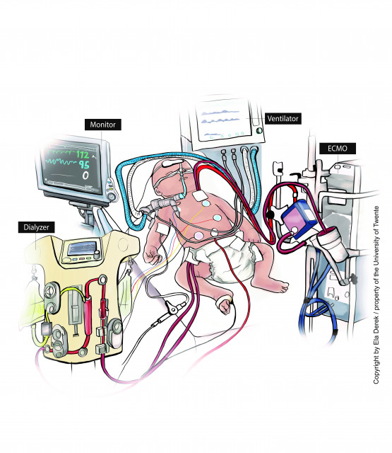 The UT scientists’ goal is to replace the separate mechanical ventilator and the dialysis machine and develop an artificial placenta - one combined device for lung and kidney support which would be connected to the baby’s belly button. ‘This would result in much less invasive treatment provided to an awake and responsive baby,’ says professor Stamatialis. ‘With an artificial placenta, the baby doesn’t need to be sedated and it can interact with the family. This is very important – the impact on parents is a big part of this issue.’