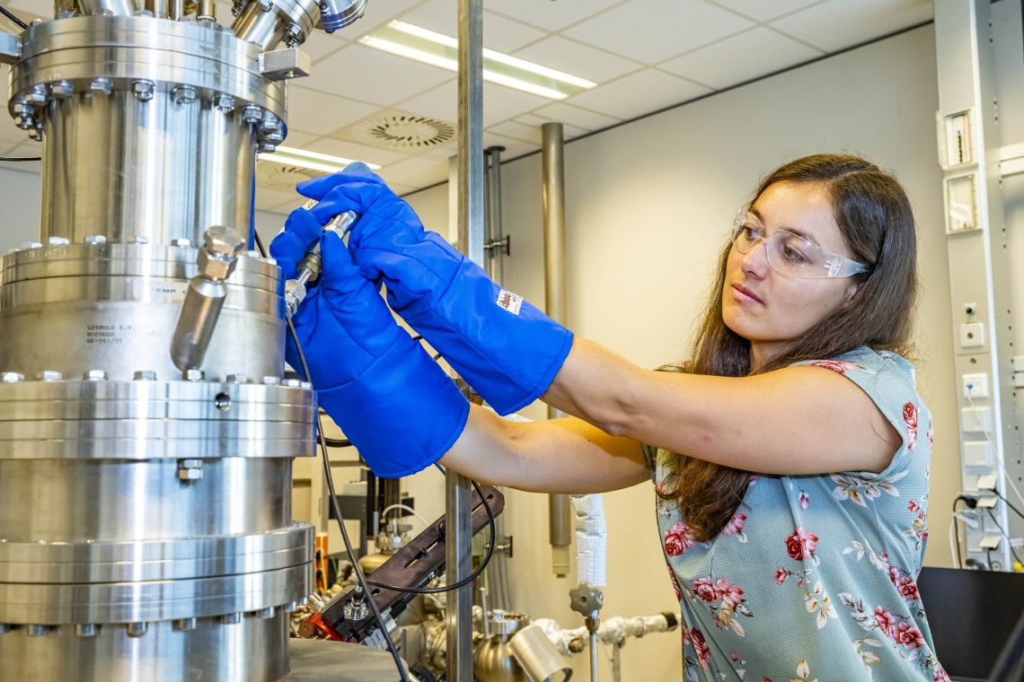 His colleague, scientist Carolien Castenmiller, closely involved in the research, connects a tube to this so-called Scanning Tunneling Microscope (STM), supplying it with liquid nitrogen, to cool it. ‘Using the STM, we can study the properties of the sample’, she explains. ‘We can measure and visualize the structure of the surface, which defines the properties of the material. Even individual atoms are visible.’