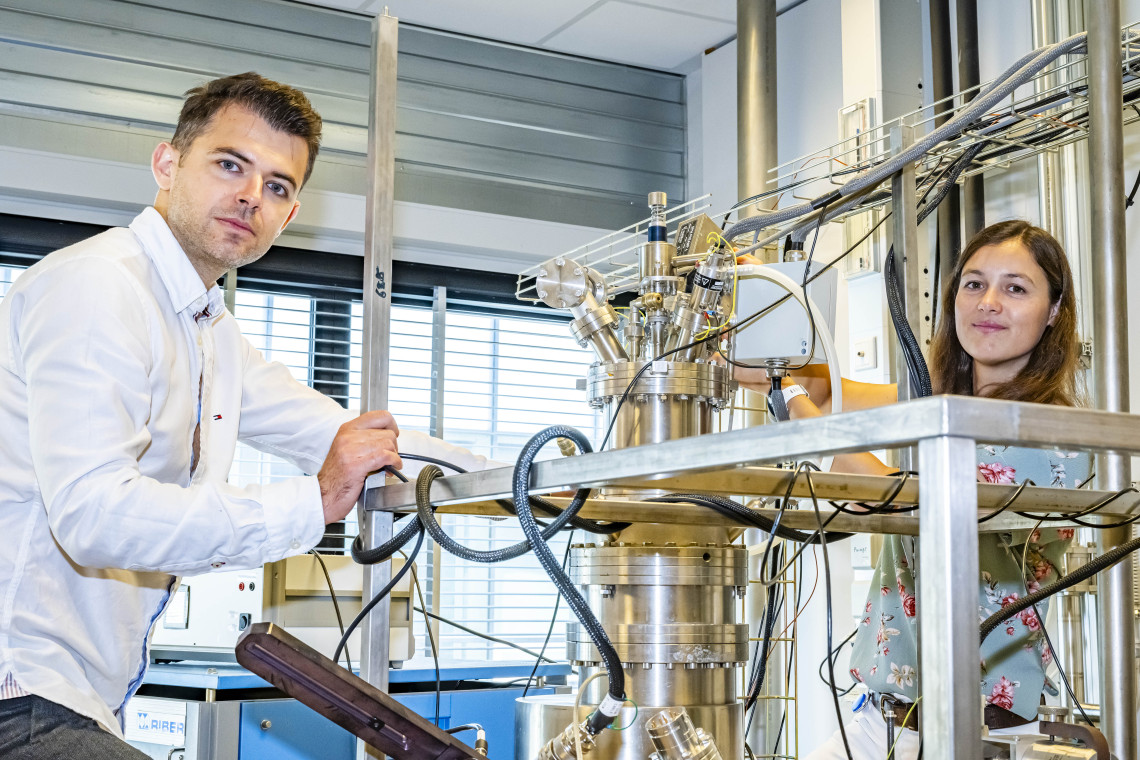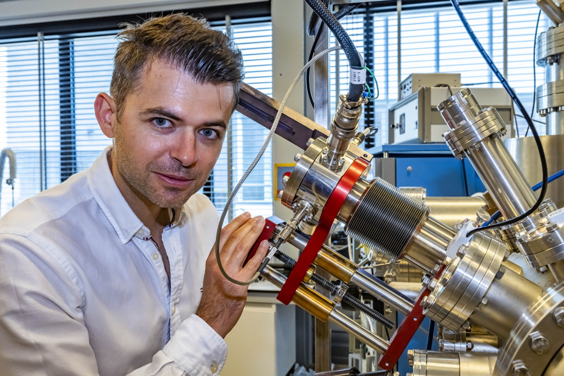 ‘Research on topological insulating substances opens a completely new field in physics and may revolutionize electronics’, Bampoulis says. ‘These special materials may substantially reduce energy consumption, and they also have a lot of potential in quantum computers.’ He places a holder, containing a small, flat piece of the material, germanium, inside an impressively looking machine.