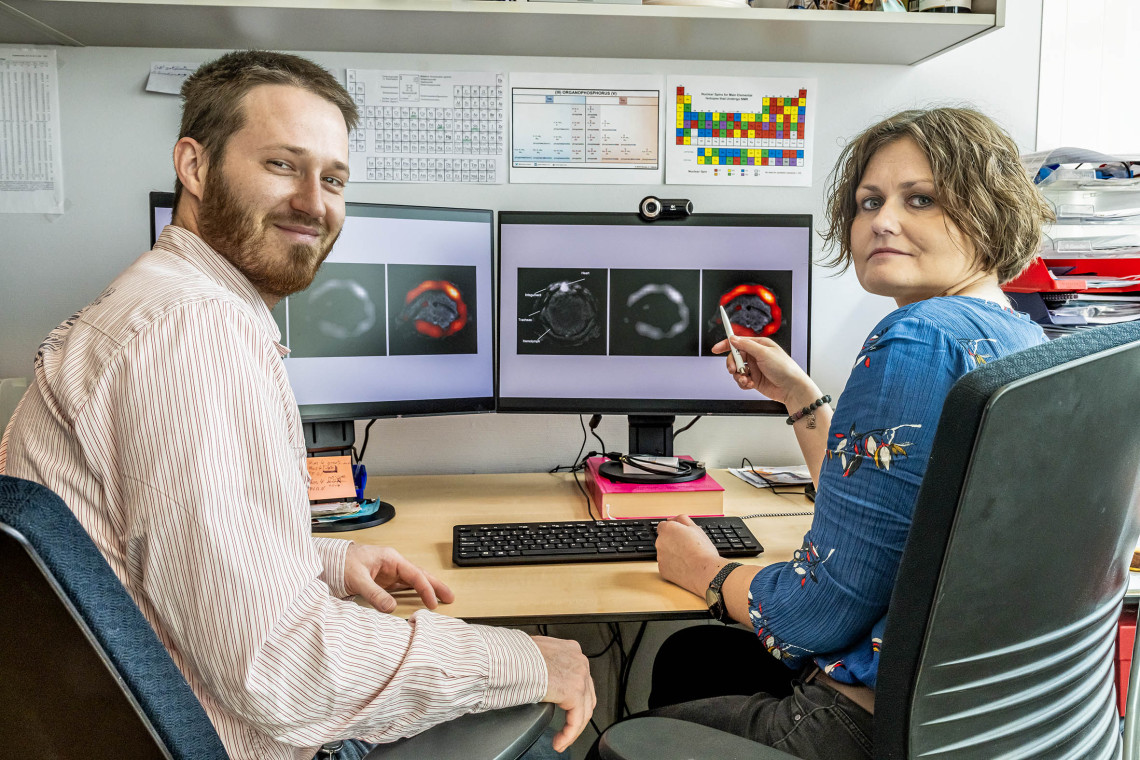 Project partner Timo Rheinberger has been working on designing new molecules for quite some time in the group of Frederik Wurm before he joined Koshkina’s team. ‘It was fundamental, curiosity-based research, where I designed and built molecules based on phosphorus’, he says. Natural phosphorus (P) has in theory the right properties to be used as an MRI imaging agent, and could replace the current contrast compounds.