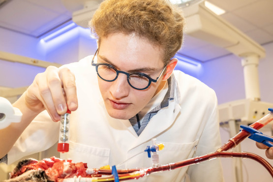 The operating room in UT Twente’s TechMed Centre is the scene of an unusual sight this morning: a severed sheep’s head lies in a plastic tray on the operation table, while different transparent blood-filled hoses, stick out the neck. The hoses are connected with the brain’s arteries and supply it with a steady flow of the sheep’s blood to mimic the brain of a live animal. Several people of Khalil’s team are looking at different screens, where a 3D network of the sheep’s brains vessels is visible. Another screen shows an X-ray of the head, and the vertebrae can clearly be seen. ‘We used a CBCT scan to make this 3D image of the blood vessels’, Khalil explains. ‘Now we can determine the route that the micro-bot will travel inside the brain.’