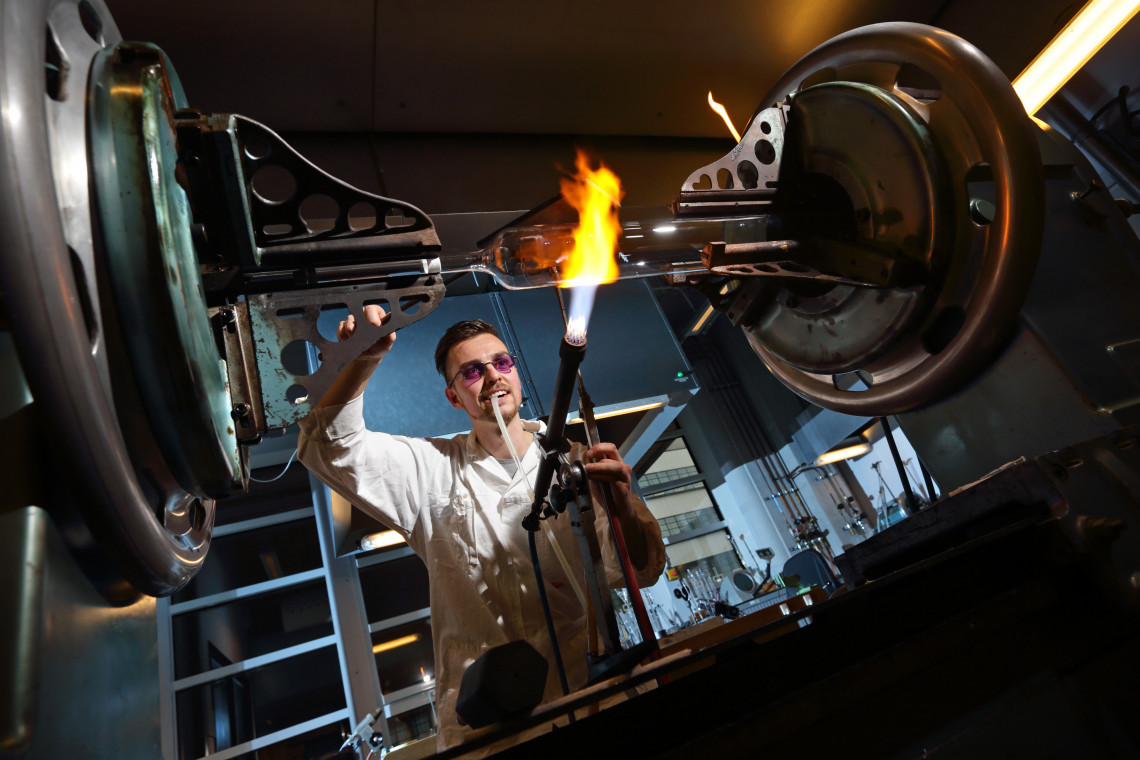 Kooijman werkt nu goed tien jaar op de UT. Hij kwam vers van de opleiding, de mbo studie bij de Leidse Instrumentmakers School. Het is de enige glas-opleiding in Nederland. ‘Ik liep stage bij de UT en kon blijven. Naast het werk kon ik een hbo-opleiding werktuigbouwkunde doen. Een pad dat meer glasinstrumentmakers volgen. Uiteindelijk gaan ze vaak, net als ik, richting design engineering. Meer naar het ontwerpen van instrumenten, dan dat je ze met de hand maakt.’