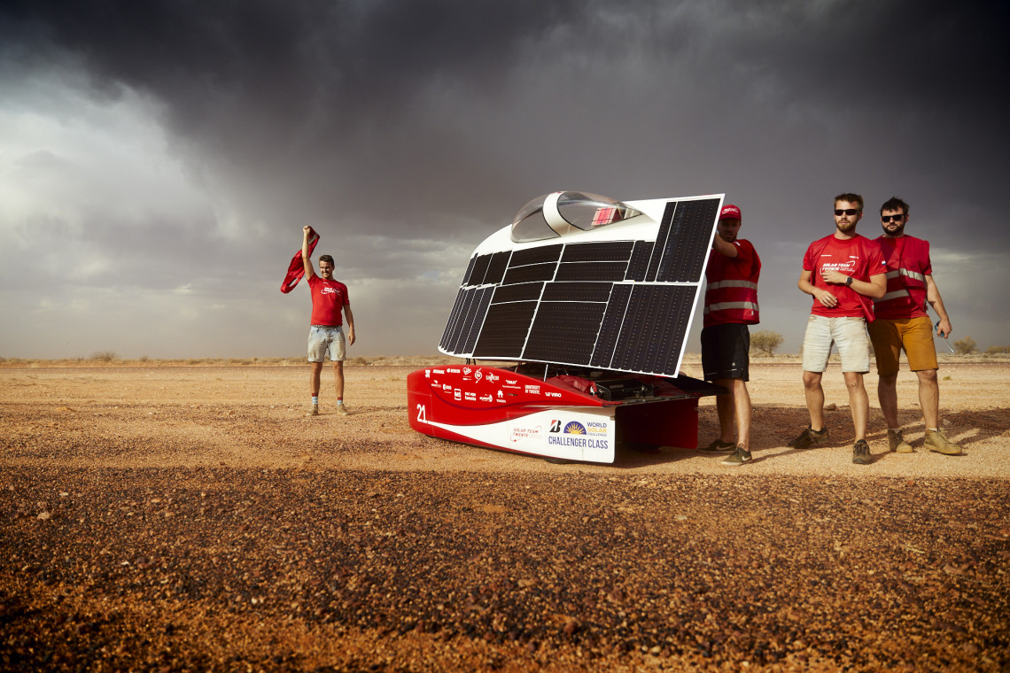 Medio juni onthulde het team zijn auto, de ‘RED E’, in de Grolsch Veste. Vervolgens moesten de leden de stap maken van constructieteam naar raceteam. Vijf weken voor de wedstrijd in oktober was een meer dan voltallig Twents team al in startplaats Darwin. ‘Behalve wijzelf gingen nog tien oud-leden en tien externen mee, onder wie fotografen, een filmploeg en een weerman’, vertelt Dekker. ‘Die had een belangrijke rol. Het luistert namelijk best wel nauw om de sterkte van de zonnestraling kilometers verderop te voorspellen. Op basis van die informatie konden we bepalen of we langzamer of sneller moesten rijden.’