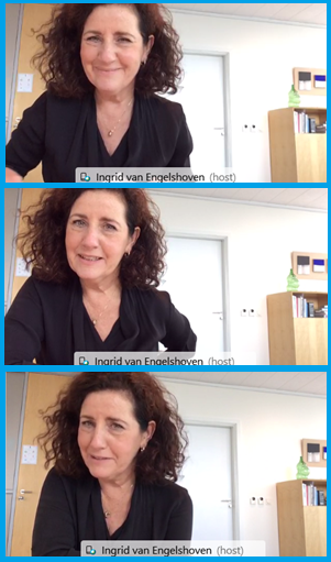 Ze heeft er inmiddels routine in. Klikken op de meeting, geluid en camera aan en daar is ze: de minister in haar werkkamer. Op gepaste afstand achter haar, op minstens anderhalve meter, zwaait haar woordvoerder naar de camera.