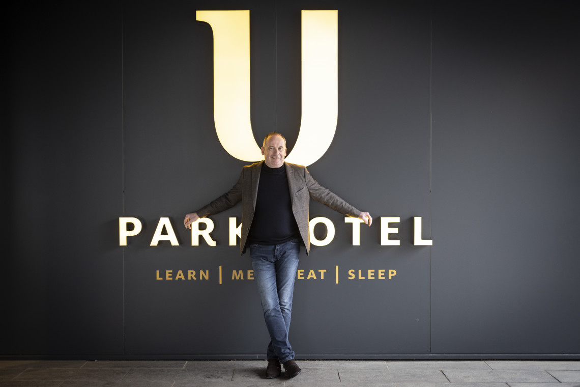 Hij knijpt zijn handjes dicht met het U Parkhotel. ‘Het is een jaloersmakende vergaderlocatie, gecombineerd met een familiaire Twentse gastvrijheid. Een regionaal bedrijf met een internationale allure’, schetst de nieuwe directeur. ‘Dit pand is zó stoer, dit had net zo goed in een rauwe havenstad als Hamburg kunnen staan. Ik zou niet zomaar een referentiehotel kunnen opnoemen.’