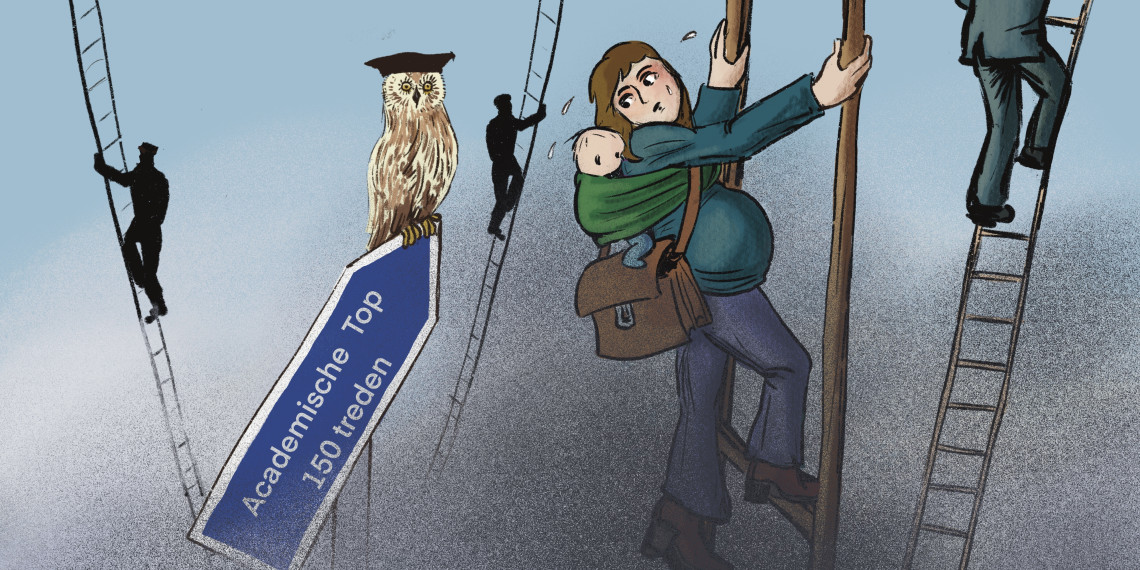Endedijk: ‘Toen ik veertien jaar geleden mijn dochter kreeg, was ik al universitair docent. Een kind krijgen tijdens je promotie werd toen afgeraden. Mijn leidinggevende reageerde enthousiast, maar ouderschapsverlof opnemen was niet aan de orde. Pas toen ik een nieuwe leidinggevende kreeg, kon dat wel. Mijn dochter was toen al iets ouder. Het krijgen van een tweede kind was voor mij niet vanzelfsprekend. Ik nam de secretaresse in vertrouwen, omdat ik regelmatig naar de fertiliteitskliniek moest en dat laat zich niet flexibel plannen. Ook zat ik toen in mijn tenuretrack-aanstelling. Het betekende dat ik voor de tenuretrack-commissie moest verschijnen, terwijl ik bol stond van de hormonen. Moeder zijn of worden is meer dan alleen maar even uit het werkproces zijn wegens de bevalling. Het heeft veel impact en kost veel energie en dat is niet altijd zichtbaar. Ook later, als je kinderen op de middelbare school zitten, hebben ze nog zorg nodig. Als ik help met huiswerk, kan ik niet werken aan een onderzoeksvoorstel.’