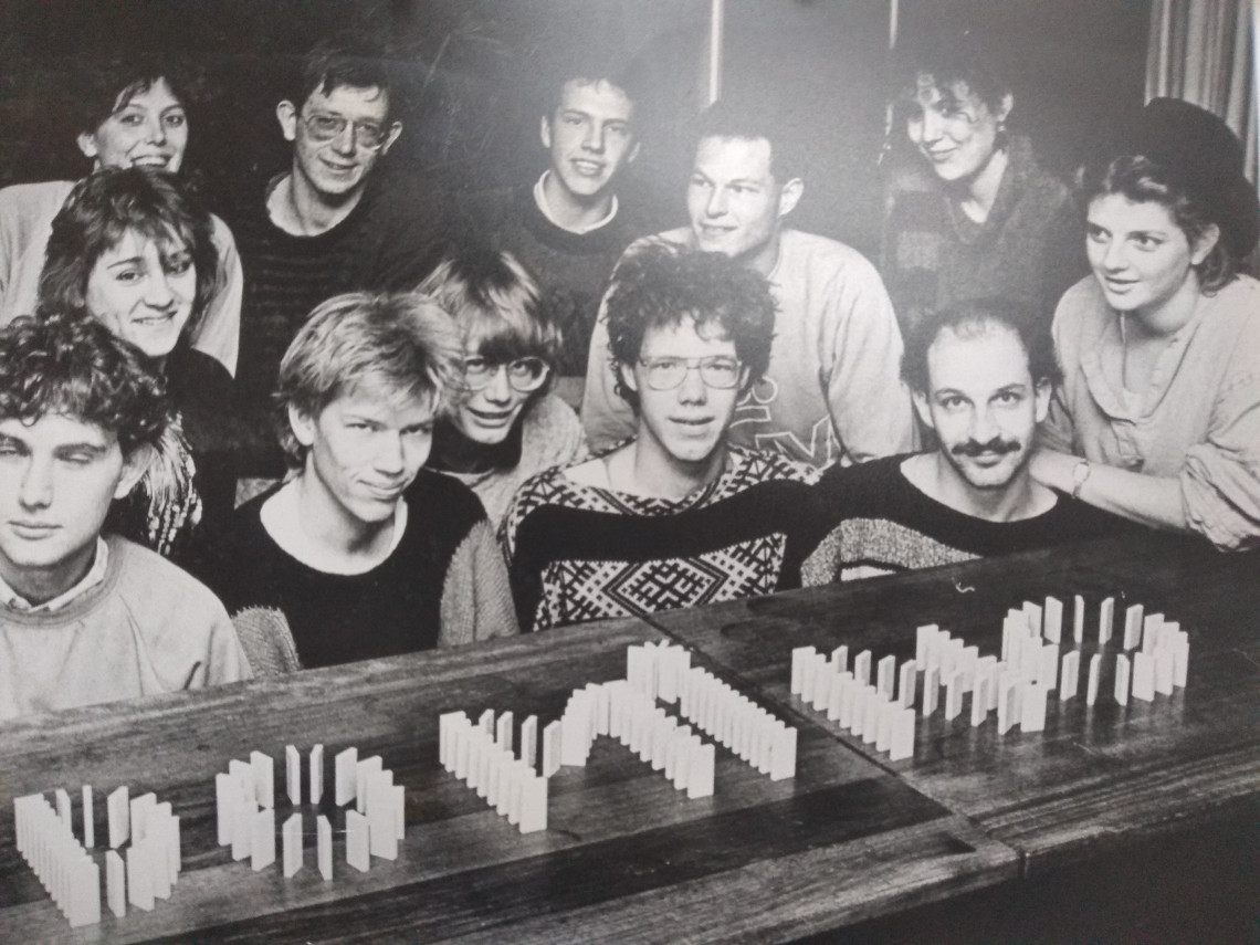 Het huidige wereldrecord, gevestigd in 2009, staat op 4.491.863 omgevallen dominosteentjes. De allereerste recordpoging dateert echter al uit 1986. Vijftien UT-studenten droegen hun steentje bij aan dat project. Onder hen Arjan van Houwelingen, toentertijd student bedrijfskunde aan de UT. ‘Ik woonde aan de Calslaan 34, toen een van mijn flatgenoten een briefje had gezien met een oproep om mee te doen als bouwer.’