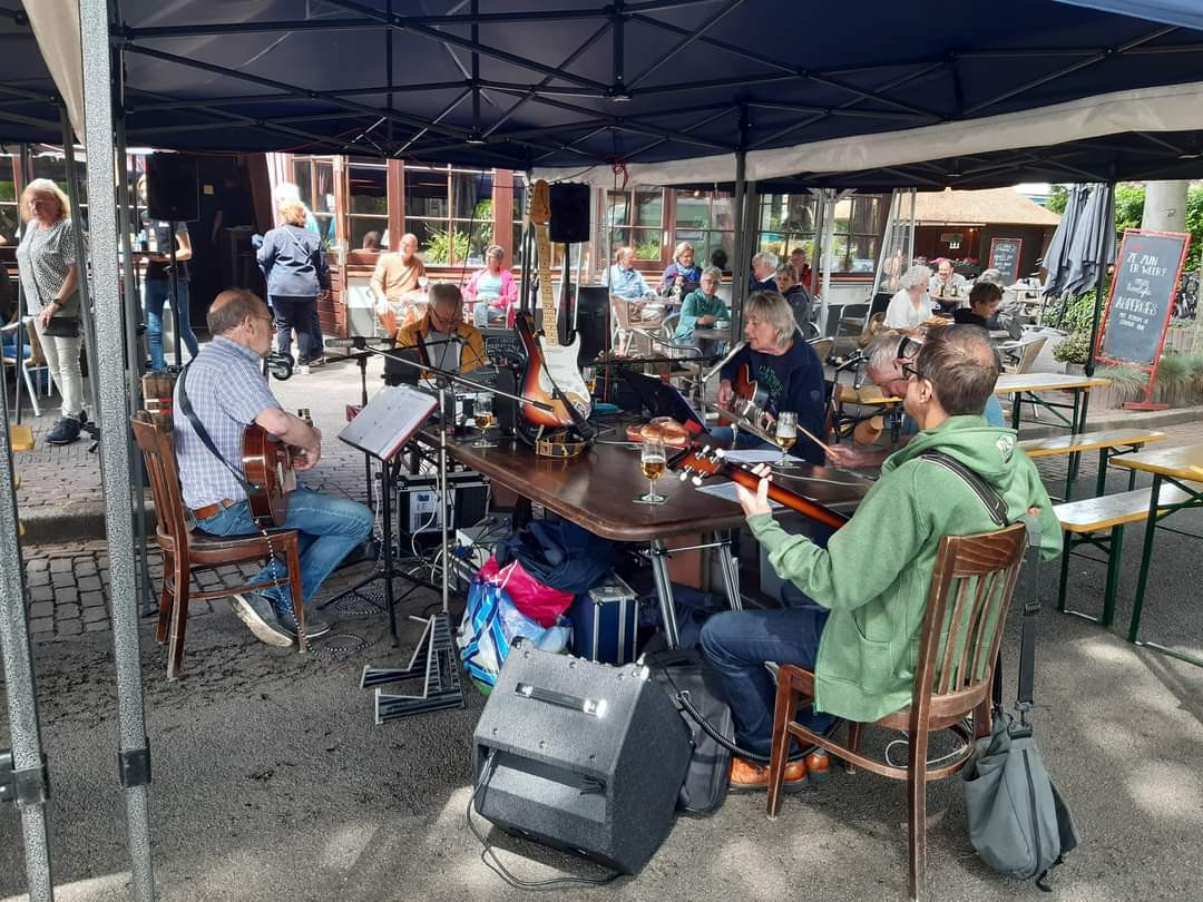 Onder de naam Jan Akku aan Tafel konden inwoners van Gorssel en omstreken gisteren luisteren naar muziek van de THT-band, die op straat rond een grote tafel zat. Net als vijftig jaar geleden speelden de mannen lange nummers. Van der Kamp: ‘Daar houden wij van, minutenlange nummers. Dat was in onze begintijd overigens heel normaal, maar het wordt niet altijd gewaardeerd. Op mijn eigen bruiloft bijvoorbeeld mocht ik maar drie nummers spelen. Daar hield ik me keurig aan, maar toen waren we wel ruim een uur verder.’