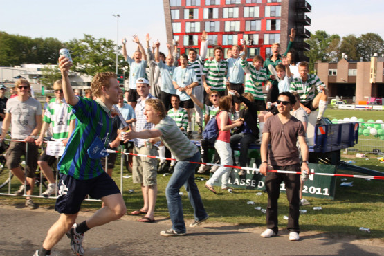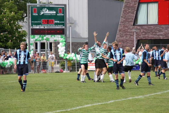 Al snel na het eindsignaal ontbrandde de feestvreugde. De voetballers hadden namelijk de nodige voorzorgsmaatregelen getroffen. De dag voor de kampioenswedstrijd zetten ze een tent op, op het campingterrein voor de Batavierenrace, met daarin honderden blikjes bier. Die duizenden Bata- c.q. feestgangers die op de campus samendrongen hebben echter nooit hun weg naar de goudgele schat gevonden.